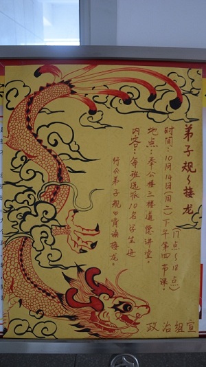中华优秀传统文化源远流长,博大精深。为弘扬传统文化,加强道德教育,浓厚校园文化氛围,郑州市实验高中全体学生深入学习并努力践行以《弟子规》为主的系列传统文化经典,通过每周观看《弟子规》视频和德育小故事,并通过学校广播站、黑板报、电子屏进行宣传,同时,德育处将学习优秀传统文化作为学校德育考核的重要内容,通过一系列的方式引领学生与圣贤为友,与经典同行。经过一年的学习,郑州市实验高中于2014年10月14日、15日、19日开展为期一周的主题为“弘扬中华优秀文化,打造精彩人生底色”中华优秀传统文化汇报展,展示内容丰富多彩,各班学生展出了水平,展出了内涵,展出了精彩。