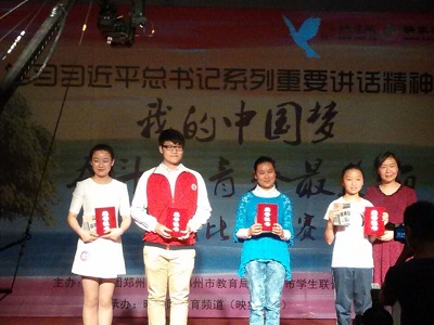 “我的中国梦——奋斗的青春最美丽”郑州市大中学生演讲比赛自2014年12月开始,经历了初赛,复赛两个阶段,最终有来自全市不同学校的40名选手进入决赛,每一个参赛选手都从不同侧面诠释了他们对中国梦的认识,他们用身边的事例和生动的语言阐述了心中的中国梦,展示了深厚的演讲功底,同时也彰显了当代学生积极向上、为实现中国梦奋斗砥砺的精神风貌。郑州市实验高中作为参赛的单位,学生代表郭震辉进入决赛,在决赛中更是获得了高中组一等奖的好成绩。 在得知我校学生进入决赛的通知后,学校领导高度重视,校团委按照比赛要求认真选题、组织演讲内容,在语文老师路晓沛的指导下,郭震辉同学准备充分、沉着冷静、稳定发挥,展现了我校学生的良好气质形象,为学校赢得了荣誉。 “奋斗的青春最美丽”,以此次活动为契机,郑州市实验高中引导实高学生牢固树立并积极践行社会主义核心价值观,明确不怕挫折、不畏困难,顺境不骄、逆境不馁的精神导向,把追求梦想的途径方式聚集到“奋斗”这个关键词上,鼓励实高学生用脚踏实地的奋斗为实现中华民族伟大复兴的中国梦贡献青春力量。