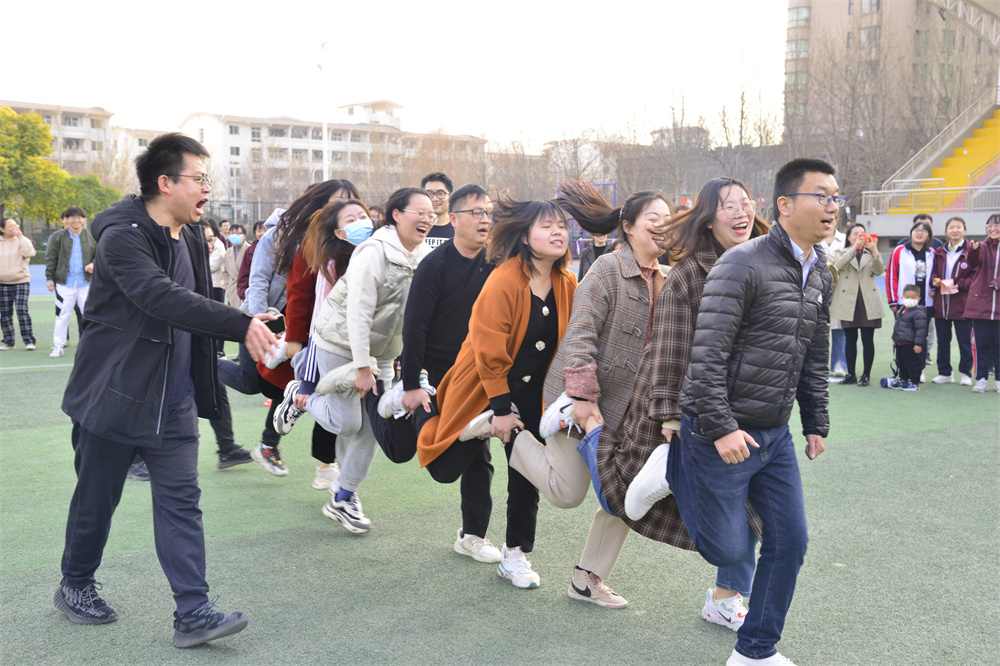 裁判一声令下,动力火车开起来。一队十人,前面老师把右小腿后曲,后面老师抓住前面老师的腿,比的是速度,老师们团结一致,齐力向前。在蒙眼吃橘子环节,老师们更是笑翻全场,两人一组,一人蒙上眼睛,原地转三圈,然后在同伴指挥下去果盘拿橘子并负责剥开喂同伴吃,另一人负责坐在凳子上指挥和吃橘子,蒙眼喂橘子的老师难度比较大,方向感不好的老师转三圈之后可能就找不到前进的路了,在同伴的指挥下摸索前进,这场景让在场的观众乐得合不拢嘴。在一圈到底活动中,女老师们12个人为一组,利用肢体把呼啦圈从第一个人传递到最后一个人,完全是对身体灵活度的一种考验。最后的健步走环节,全体老师跟着音乐的律动,一起在这美好的阳春三月动起来。