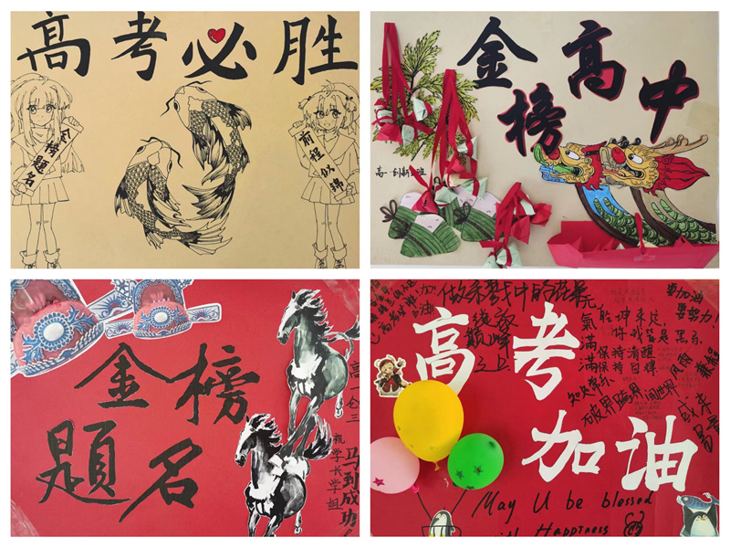 走进实验高中科学楼一楼大厅,迎面而来的五块展板已经被高一高二学子布置得满满的。横着的三块上贴满了高一年级送来的创意满满的海报,如高一创新五班制作的“鱼跃龙门看今朝”、“金榜高中”,高一科学四班的“我为高三举大旗,看谁敢与他为敌”,还有高二实验三班的“高考必胜,金榜题名……”另外竖着的两块展板上是高二年级学子们送来的“心愿墙”,密密麻麻地写着对高三学长们的祝福。高二英三的袁芳菲深情的写道:“放平心态,全力以赴,6月7日,以挺拔的姿态去赴约吧。所有苦难和背负的尽头,都是行云流水般的此世光阴,不要怀疑自己,你一定可以”。