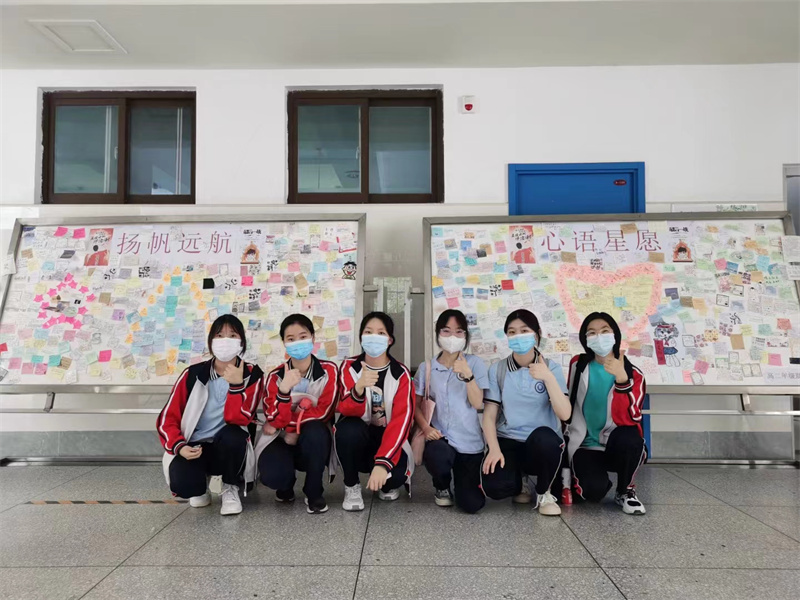 同学们与写满祝福的”心愿墙”合影