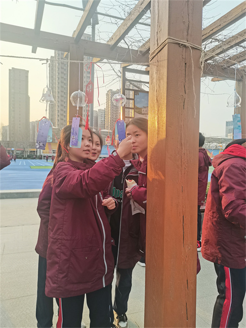 风铃本身就有吉祥美好的寓意,学生把心愿写在其中,春风吹来,叮咚叮咚的声音在校园响起,这是风铃的歌,也是幸福的声音。高一创新三班的冯茹艺满心欢喜地向我们介绍她的风铃:“我的愿望是家人身体健康,我自己学习有所进步,我把愿望写在纸上,风铃悦耳的声音就像在告诉我,我的愿望一定能发生、肯定会实现。”