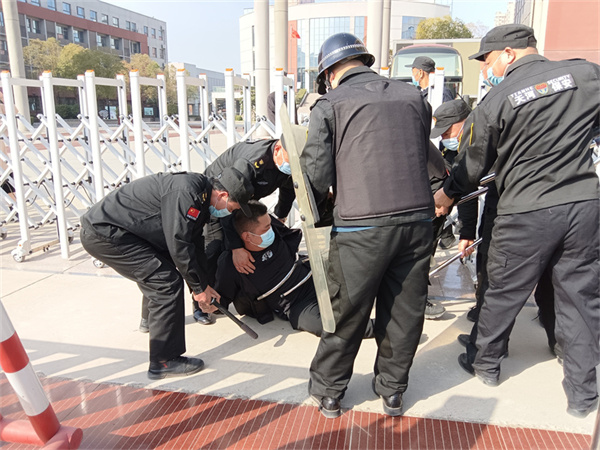 演练前,学校制定了详细的演练方案以确保演练高效有序的进行,派出所的高国强警官详细讲解和演示了各种反恐防爆器材的功能、使用方法和实操技术要领,并向安保人员详细介绍了紧急情况下的应急处置措施。上午九点半,反恐应急演练拉开了帷幕。校园东门处某不法分子持棍试图强行闯入校内制造事端,校园安保人员阻止未果立即请求支援,保安队伍快速作出反应,手持防暴盾牌、钢叉一起上前与“歹徒”周旋,经过共同努力和激烈搏斗,在成功制服“暴徒”后将其带离现场。在演练之前,在演练结束后,三位民警实地查看了学校的监控室、化学实验室并查阅了反恐档案,对学校的反恐工作给予肯定。
