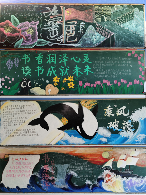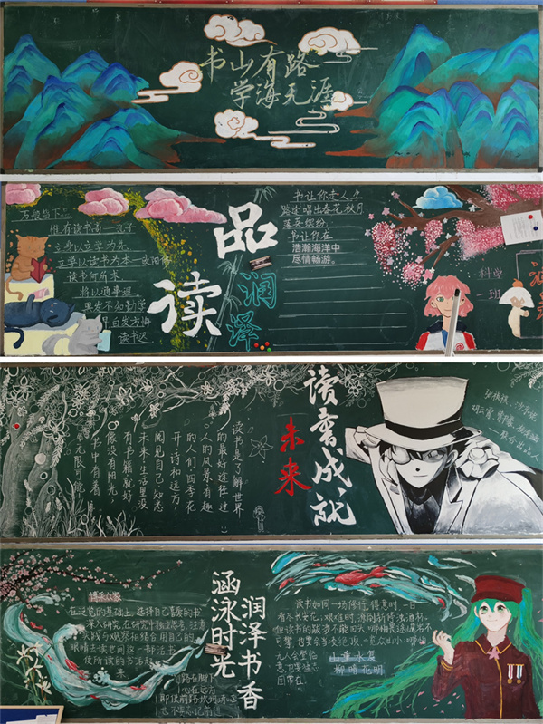 花开的四月,是读书的季节,为了丰富校园文化,用明丽的色彩和充满活力的图画激起同学们的读书热潮,发挥黑板报在校园文化宣传方面的主阵地功能,4月底,郑州市实验高中高二年级开展了以“书香润泽心灵,读书成就未来”为主题的黑板报评比活动。