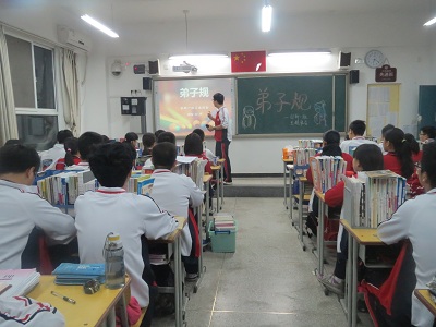 除了以上两个以个人为主的传统文化风采展以外,市实验高中还开展了以“树立典型人物,发现先进事迹”为目的传统文化主题班会。各个班级发挥创意,从不同角度学习中华经典,弘扬优秀传统文化。比如实验二班开展了主题为“弟子规”班会,除了学生主持、小组讨论、教师总结等环节,还通过讲故事、树立身边的榜样、观看视频《FORK》来深度解读《弟子规》中的各个篇章,最后实验二班全体师生进行庄严的宣誓,在誓言中他们坚定了 践行传统美德的信念。