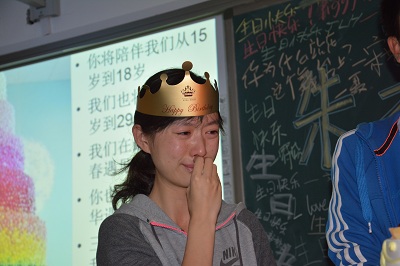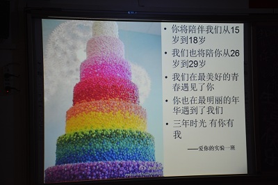 生日会当天,朱老师在进班前就被蒙上了眼睛。走进班级,映入眼帘的是满满一黑板实验一班学生对朱老师最真挚的祝福,老师霎时泪如雨下。两位同学端着蛋糕慢慢地走到老师面前,全班齐唱生日歌,学生与老师一起许下生日的愿望。“你讲陪我们从15岁走到18岁,而我们也将陪你从26岁走到29岁。我们在最灿烂的青春遇见了你,而你也在最明丽的年华遇到了我们。三年时光,有你有我。爱你的实验一班!”