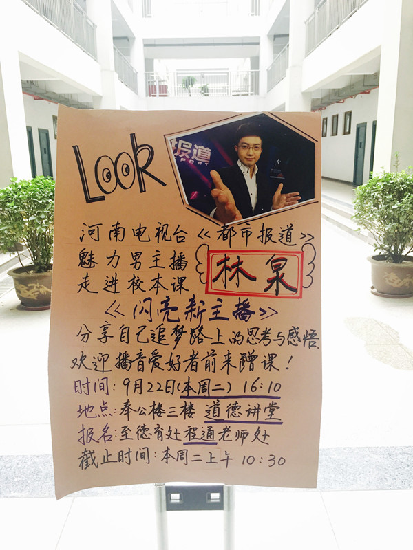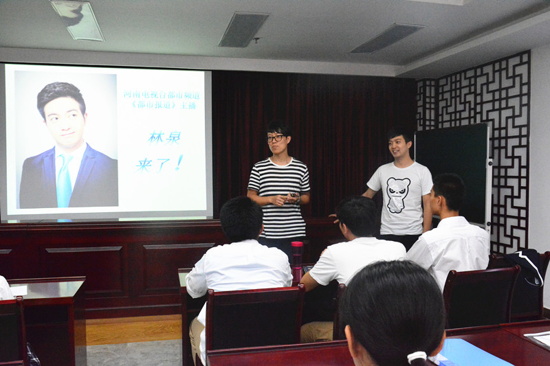 本周二下午在郑州市实验高级中学的道德讲堂里迎来了一位特殊的客人,满场座无虚席,近百双求知的双眼齐刷刷的望向台上的老师,每个学生的脸上都抑制不住激动,好奇又期待的神情.原来本身就拥有丰富主持经验的实验高中程通老师为了让学生更好的学习播音知识,了解主持人这个行业,特意请来了河南都市频道名嘴主播林泉。林泉通过讲述自己的经历,跟同学分享自己追梦路上的思考与感悟,鼓励学生抓住一切机遇,为实现自己的梦想而付出努力。当林泉主播讲到自己参加央视一些节目和主持大型晚会的经历时,台下发出一阵阵惊呼,学生们都直呼太帅了,一堂课下来学生们收获颇多,40分钟的课程转眼就结束了,下课铃声响起的时候学生们都不愿意离开教室,围着他们的新晋男神问个不停。“我觉得男神太帅了,听了他的课我很受鼓舞,本来就非常喜欢主持人这个职业,现在更有动力了!”一名高一的女生兴奋地向我们讲道。