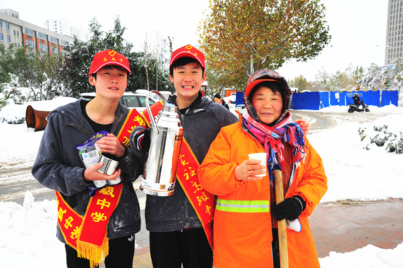 说干就干,实验高中的志愿者们拿着纸杯提着暖水壶就出发了。“叔叔,喝点热水吧!”,“阿姨,您辛苦了,喝口热水暖暖吧。”,虽是递送一杯水,却完成了一次成长的交接:亲眼见证了劳作的艰辛,积淀了以后成长的砝码。小小一杯水,浓浓感恩情,接过热水的叔叔阿姨们,脸上露出了开心的微笑,“哟,真是一群知心的孩子,你们是哪个学校的?”“我们是郑州市实验高级中学的,就在前面文化路和开元路交口,你们要是再在这附近作业,想喝热水的话可以去我们学校,哪里有专门的供水点。你们辛苦了!”听着孩子们的回答,环卫工人们都举起了大拇指,操着一口家乡话,“中,好孩子,有担当!你们学校也中!”