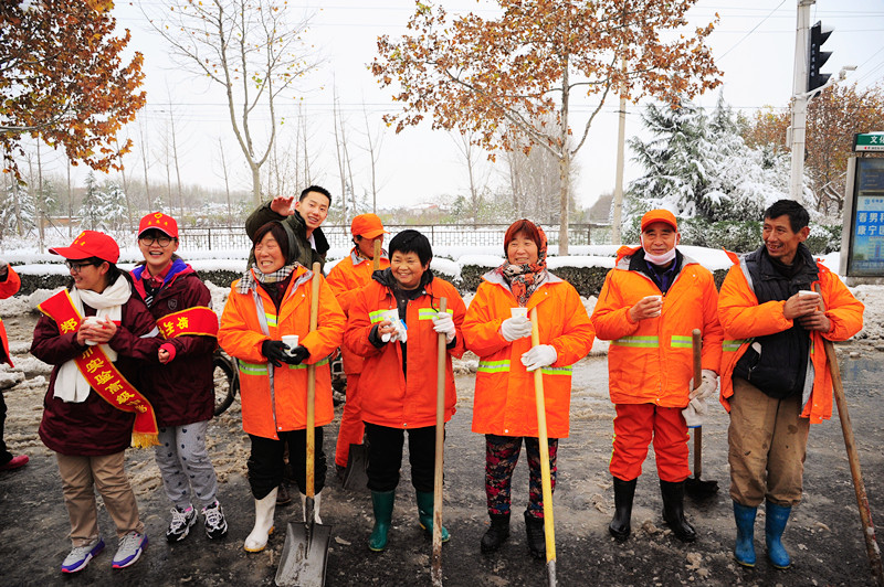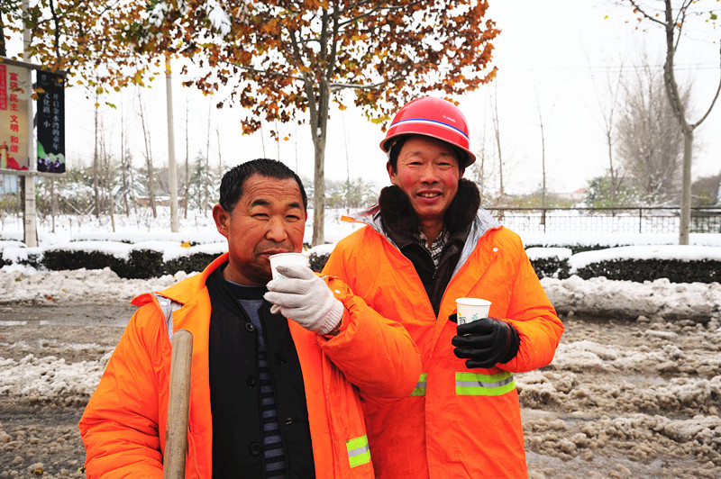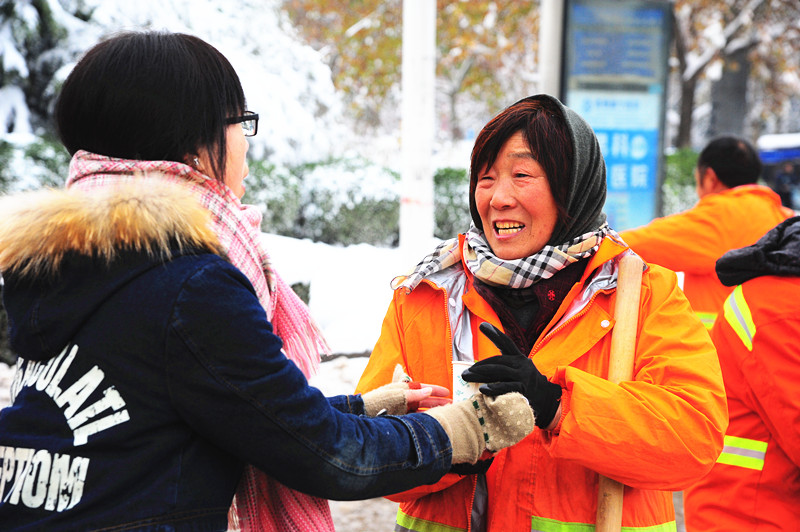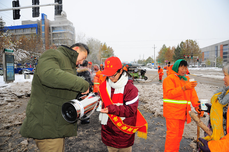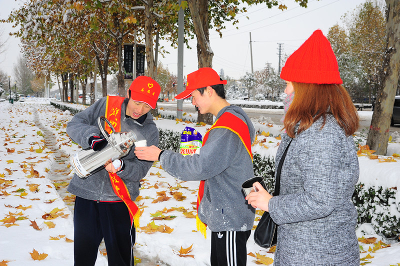 一场初雪,惊喜了一座城市,也繁忙了一群可爱的人。11月24日清晨一大早,文化路上便随处可见不顾严寒忙碌在各个主干道的环卫工人。雪还在簌簌的下,郑州实验高中的公益志愿者们按耐不住了,策划了一场“暖冬送水行”。