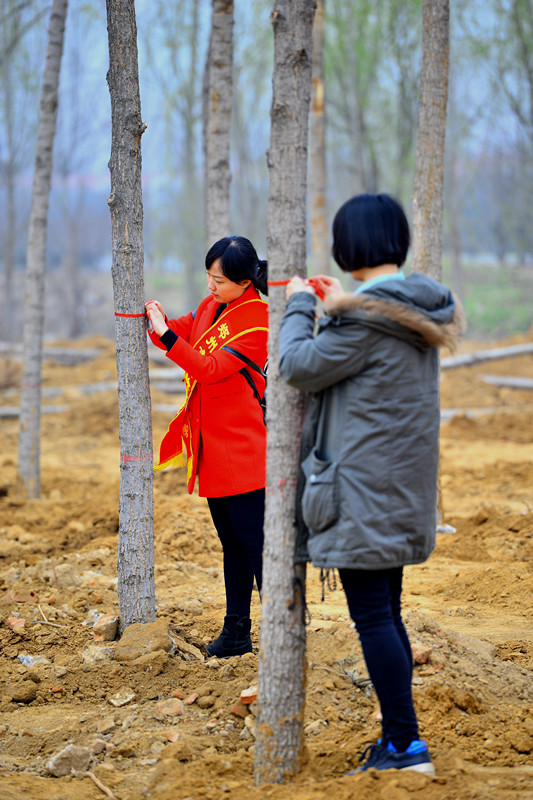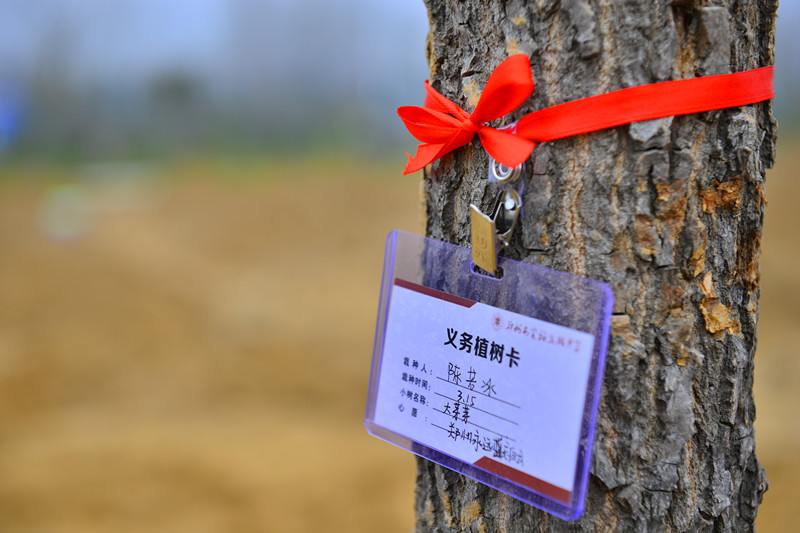 最后一棵树种完,大家回眸,“荒野”里多了“一片小树林”。这时候团委书记张华给每位老师发了一根红丝带和一个张《义务植树卡》,“领养小树”的活动开始了。小红帽,红丝带,特殊意义的卡片,开始在林子里穿梭。“我是大芽芽,我希望郑州永远蓝天白云。”“我是小茂茂,我要快快长大。”“我是倔强的大树苗,长大了洒下一片绿荫!”自此之后,小树们拥有了可爱的名字,同时他们也承载了实高教师的心愿,茁壮成长,长成一颗大树,捍卫蓝天白云,守护华夏母亲河棵
