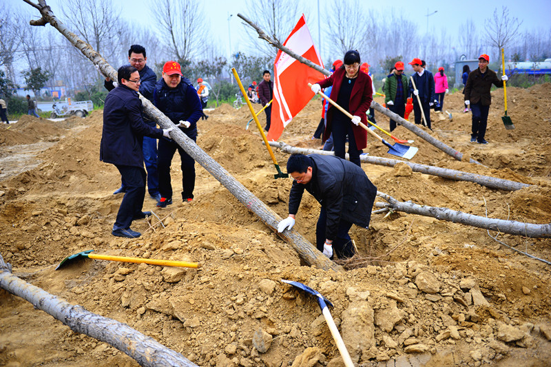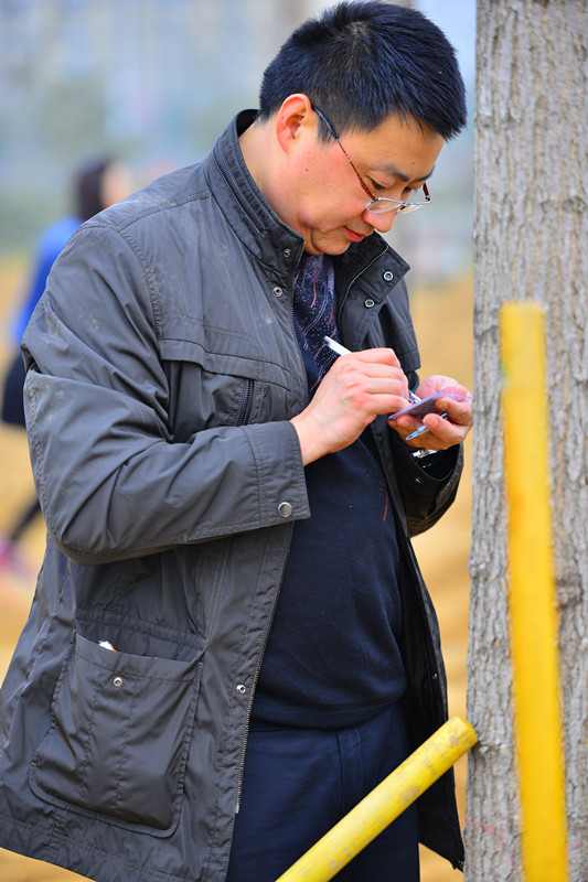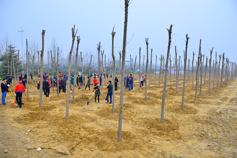 杨柳吐芽,远看已是一层绿烟,但春寒料峭,在风中还是禁不住搓搓手。实验高中的老师一下车,便看到一片“荒原”,横七竖八的“树苗”,还有机器挖出的树坑。说是“树苗”,其实是“至少五岁的小树”,“入坑”至少得三个人合作。虽然跟心里想的“小树苗”有出入,但大家还是热火朝天地行动起来。三四个人一组,先把树苗扶正,然后两个人支撑树苗,其他人培土。程序虽然简单,但还是得注意技巧,先把树根放在树坑位置,然后从树的靠末端发力,慢慢把树竖立起来,扶正之后,三两人合作支撑树干,保证树干垂直,这时候其他人均匀培土,然后踩实固定。