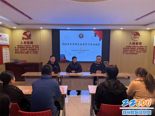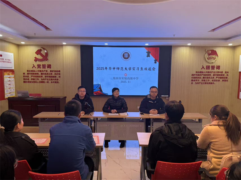 11月21日上午,郑州市实验高级中学奉公楼五楼会议室内暖意融融,2025年华中师范大学实习生欢送会在此举行,18位实习生结束为期两个多月的实习生涯画上圆满句号。该校教学副校长刘继平、教务处副主任兰龙、张俊杰及全体实习指导教师参会,共同见证学子们的成长时刻。
