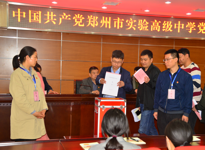 在庄严的国歌声中,党员大会拉开了帷幕。大会现场应到会党员131名,实到会党员106名,符合规定人数。根据会议流程,由该校校长孙海峰宣读《中共郑州市实验高级中学委员会、中共郑州市实验高级中学纪律检查委员会增补委员会选举办法》,经全体表决通过后,孙校长继续宣读了《中共郑州市教育局党组关于郑州市实验高级中学增补选举党委纪委委员有关工作的批复》。接着,由该校副校长杨兴涛介绍了增补党委委员和纪律委员候选人的基本情况,获得全体通过。