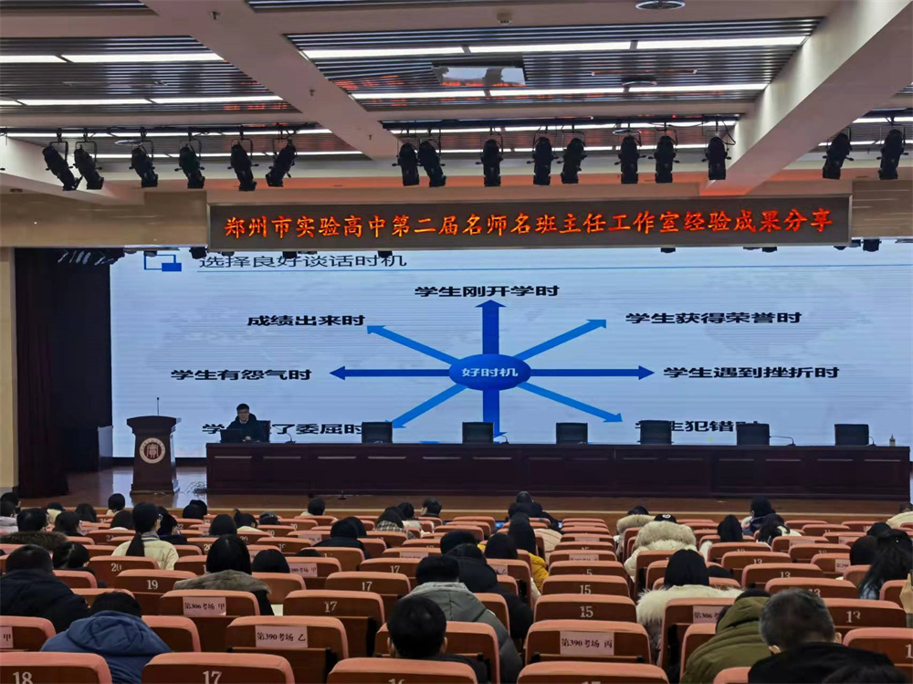 师生对话是一种传统却又非常经典的教育方法。如果说课堂授课是教师对学生传授知识和技能的重要渠道,那么与学生的个人谈话就是班主任对学生进行德育工作的重要载体。如何有效地与学生谈话,谈话前要做哪些准备?谈话的实施策略和禁忌有哪些?2022年1月4日,郑州市实验高中第二届名师名班主任工作室经验成果分享活动精彩继续,张俊杰老师代表张俊杰名班主任工作室在学校报告厅为全校老师带来了一场别开生面的报告——“如何与学生谈话”。