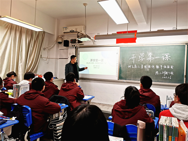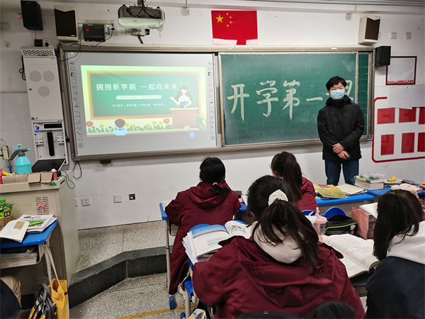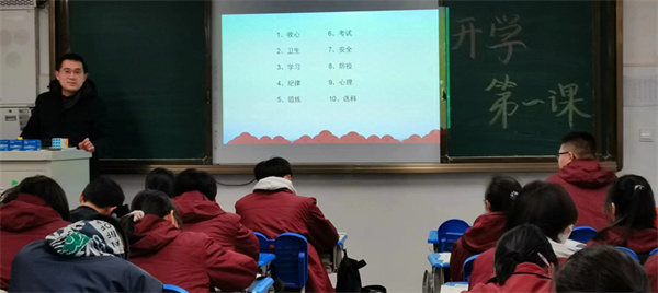 在高一英才四班的开学第一课上,班主任老师王卫增热情欢迎学子归来:“跨越漫长的假期,渡过疫情的难关,我们终于回到了日思夜想的校园。上次离别时还是秋高气爽,再见面时已是春暖花开。新学期,我们应该关注哪些地方,重新起航呢?”他通过ppt向学生们展示了新学期的十个关键词:”收心、纪律、学习、防疫、锻炼、育心……”希望大家在新的学期,快速的进入比学赶帮超的学习氛围,奏响2023的辉煌篇章。
