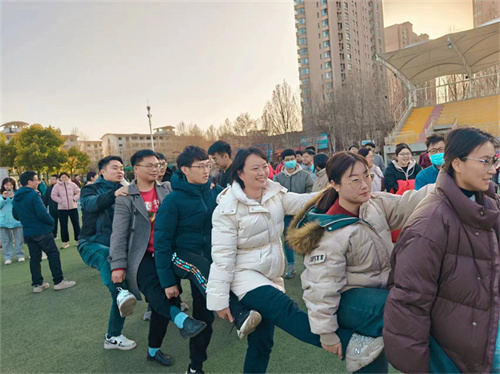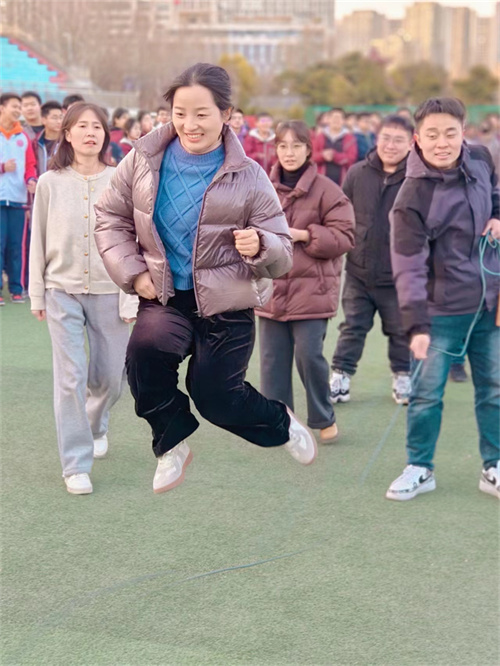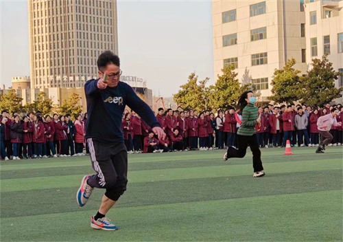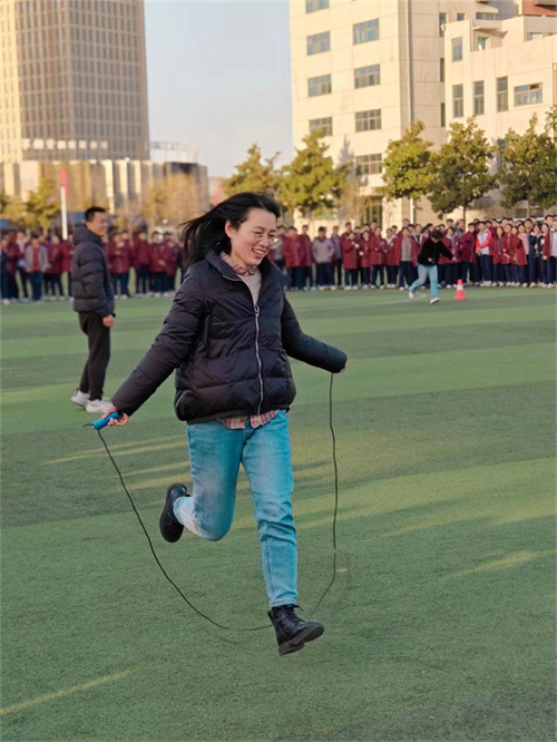 以运动之名,行青春之实,来一场趣味运动会,唤醒老师们疲惫的身躯。本次活动分为四组,分别为高一、高二、高三、行政。趣味项目分有动力火车、跳绳往返接力,跳大绳、往返接力。在体育老师赵振锡的一声哨声中,活动拉开序幕。动力火车是学校每一年的经典项目,不仅对团队成员动作的协调一致性要求高,还对老师们的体力、耐力也是一种考验;在跳绳往返接力跑环节,女教师们动如脱兔,个个比男教师发挥的出色,看着激烈的接力场景,场外的同学们大声的为老师们呐喊助威;跳大绳看似简单,但在这种紧张的氛围中,参赛选手累的直喘气,闫蕊老师说道,“这样的比赛太有趣了,不仅锻炼了身体,还活跃了紧张的生活气氛”。
