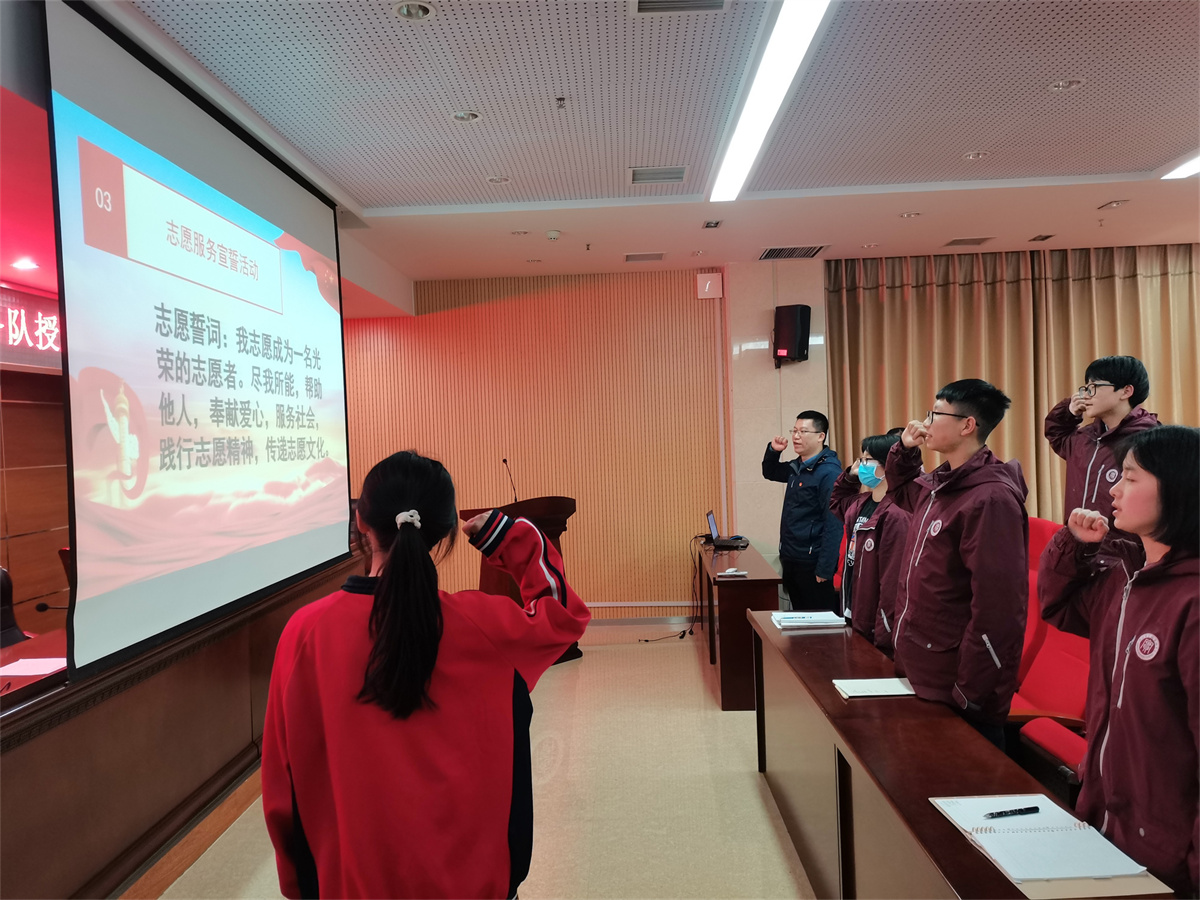 在志愿者之歌的伴奏下,志愿者代表张硕和曹蕊上前接受志愿旗,郑州市实验高级中学学雷锋志愿服务大队正式成立。志愿者代表张硕激动的说:“很荣幸能做为志愿者代表参加授旗仪式,我们接过的不仅是一面队旗,更是一种信任、期望与使命。”最后,各团支部志愿者代表在队旗下庄严宣誓,用誓言激励担当,以责任唤醒使命。