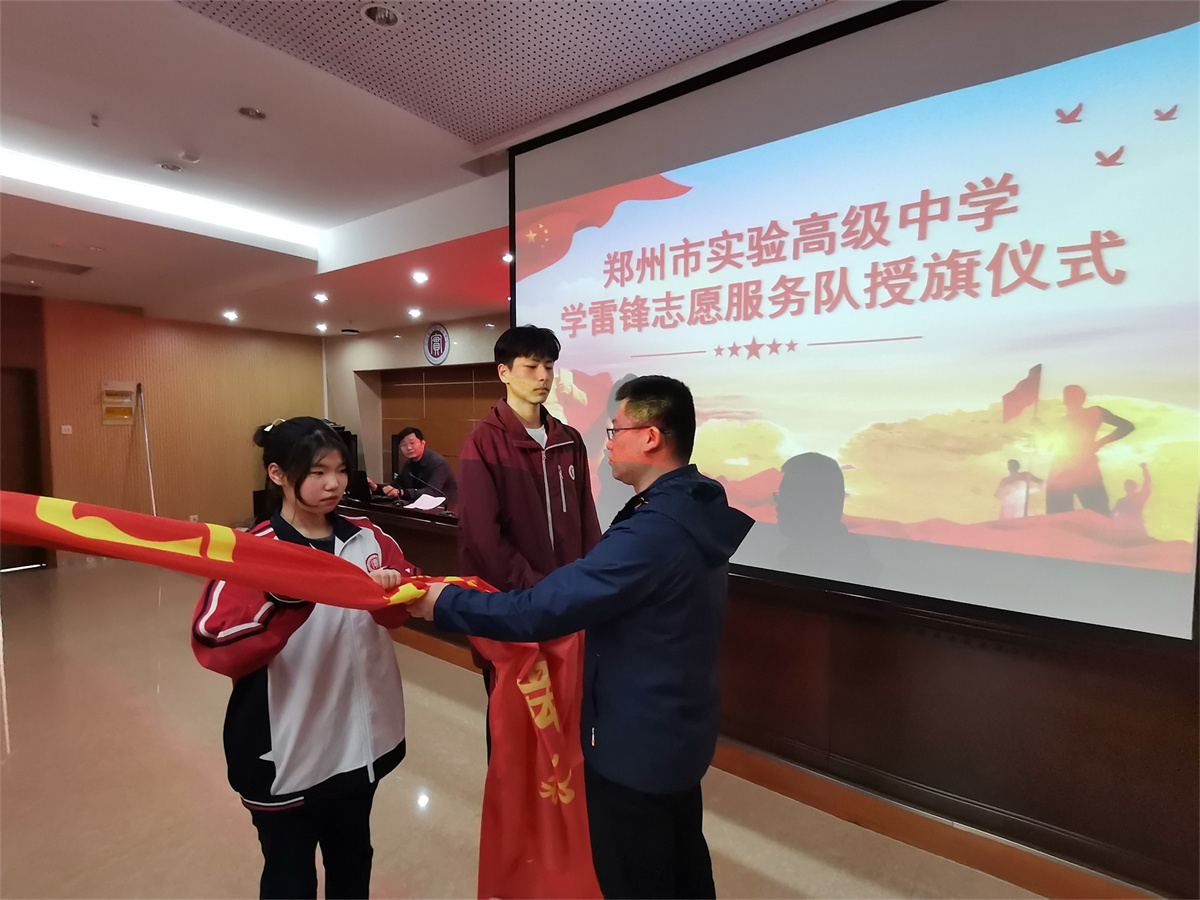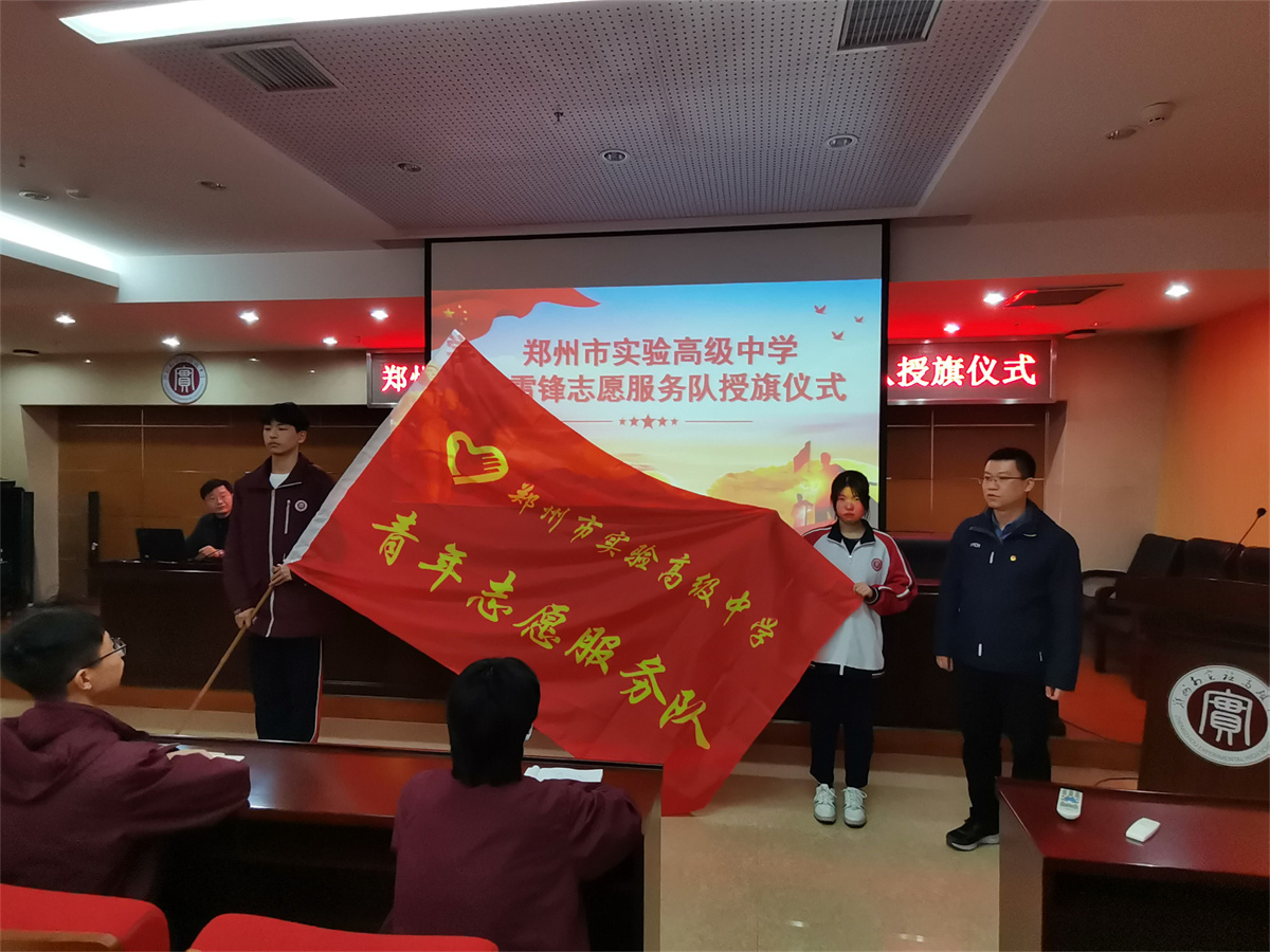 为进一步深化开展学雷锋志愿服务活动,大力弘扬“奉献、友爱、互助、进步”的志愿服务精神,引导学生以实际行动传承和弘扬雷锋精神,2022年3月2日下午,郑州市实验高中成立学雷锋志愿服务大队并举行授旗仪式。仪式由学校团委文体委员郑向前老师主持,各团支部志愿者代表、社会公益社同学参加。